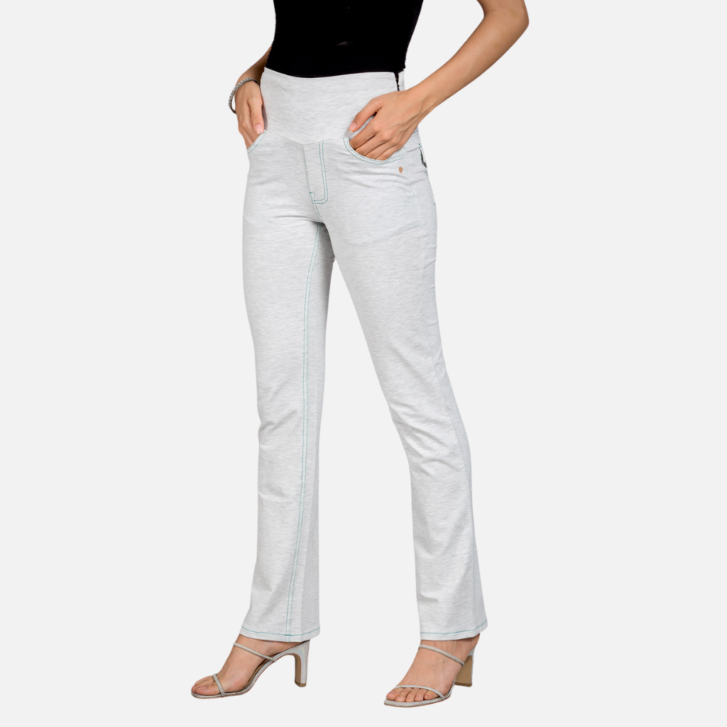 The Tulip Comfort Wear White Accrue Melange Stretch Walking Pants are designed for the woman who balances a busy schedule with a need for ease. They offer a clean structured look that transitions naturally from morning meetings to evening social hours. Crafted from a premium melange stretch fabric this pair provides a unique textured appearance with the soft breathable feel needed for all day wear.