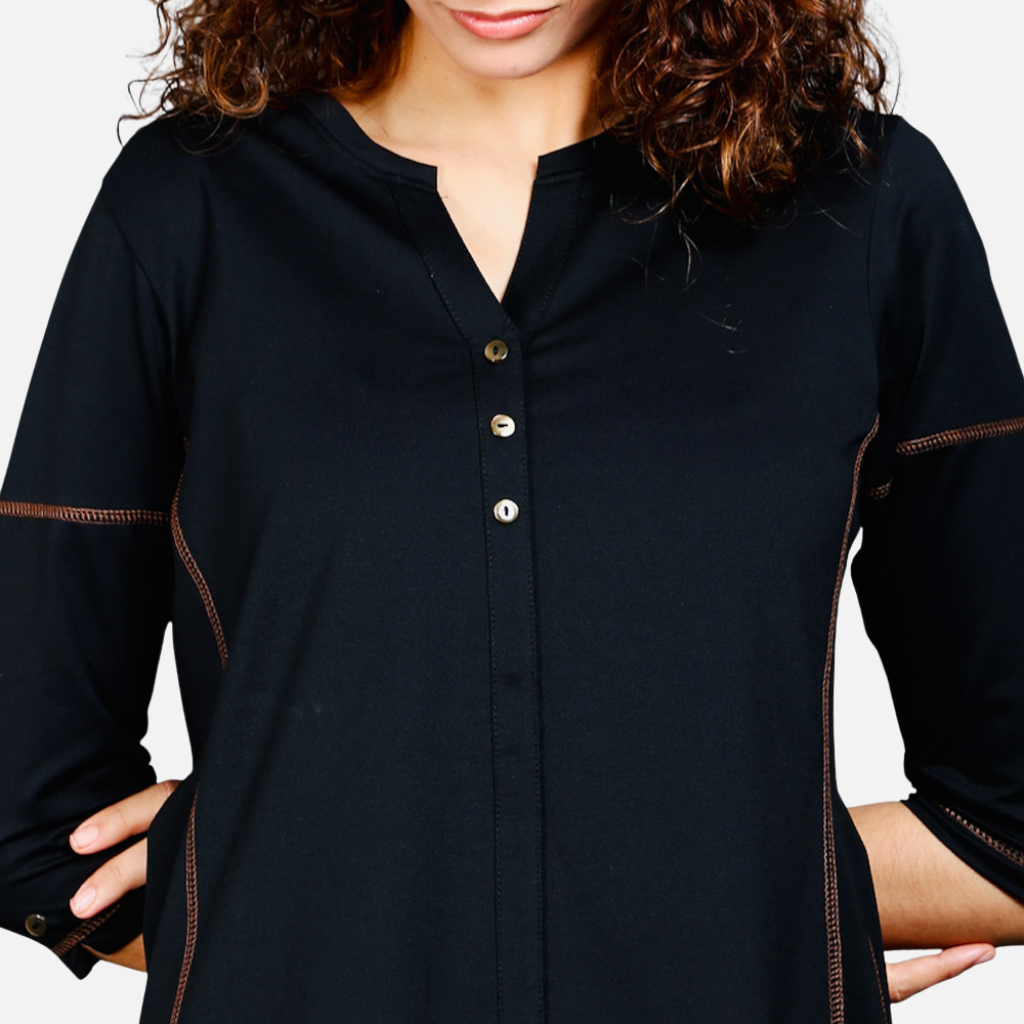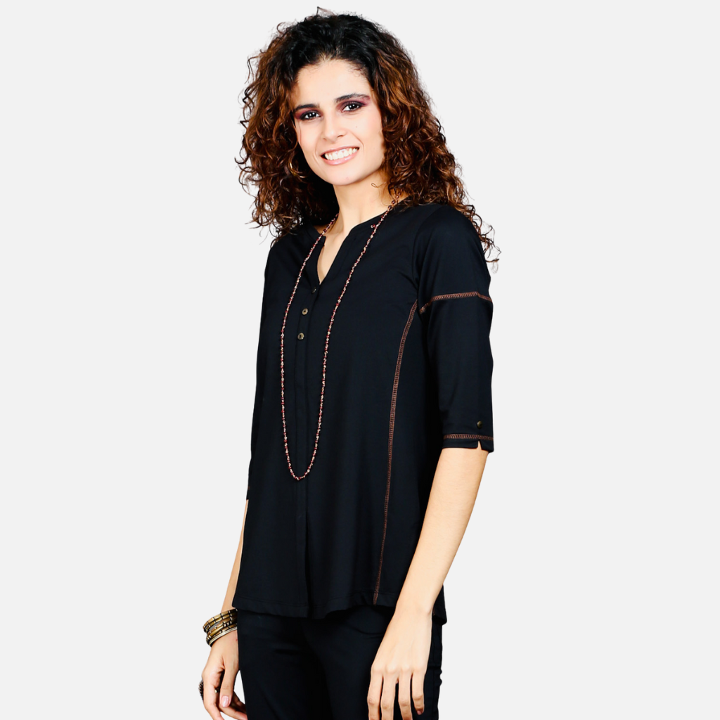 The Black Long V Neck Top with Brown Threadwork: Design & Details