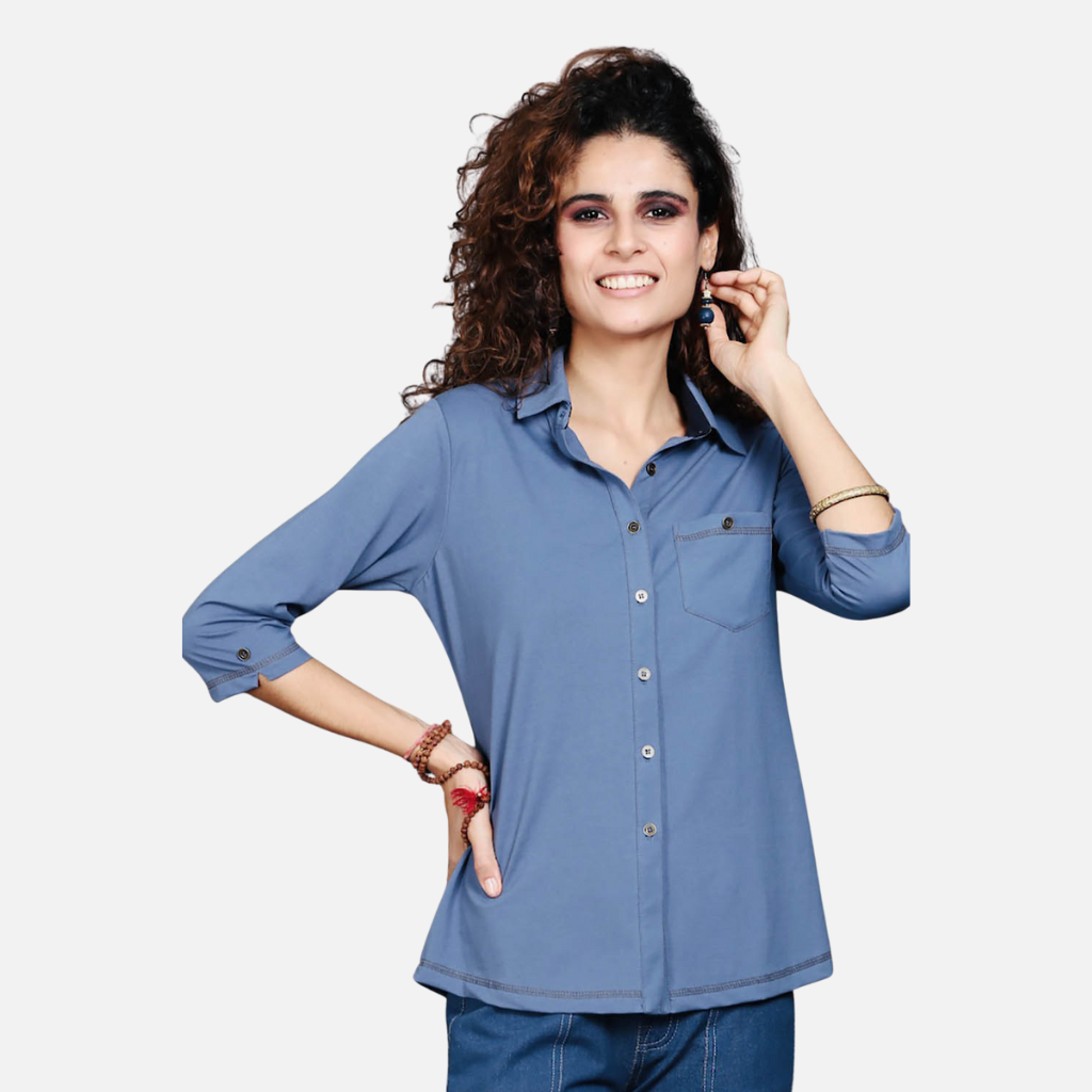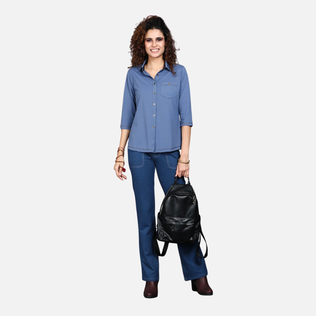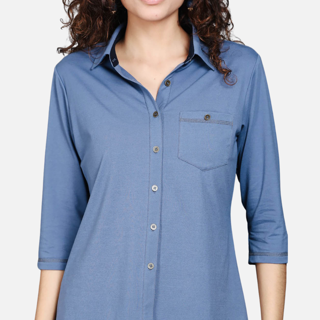The Tulip Comfort Wear Medium Blue Cotton Stretch Shirt is designed for the woman who balances a busy schedule with a need for ease. It offers a clean structured look that transitions naturally from morning meetings to evening social hours. Crafted from a premium cotton rich stretch fabric this shirt provides a calming blue tone with the soft breathable feel needed for all day wear.