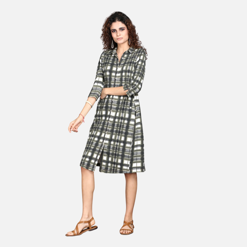 The Off White with Olive Grey Checks Cotton Stretch Dress: Design & Details
