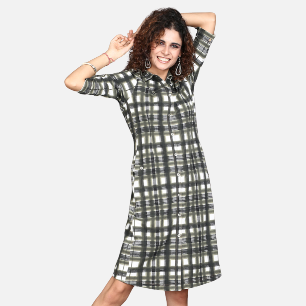 The Tulip Comfort Wear Off White with Olive Grey Checks Cotton Stretch Dress is designed for the woman who balances a busy schedule with a need for ease. It offers a clean, structured look that transitions naturally from morning errands to evening social hours. Crafted from a premium cotton rich stretch fabric, this dress features a timeless checkered pattern in a sophisticated neutral palette, providing a polished aesthetic with a soft, breathable feel for all-day comfort.