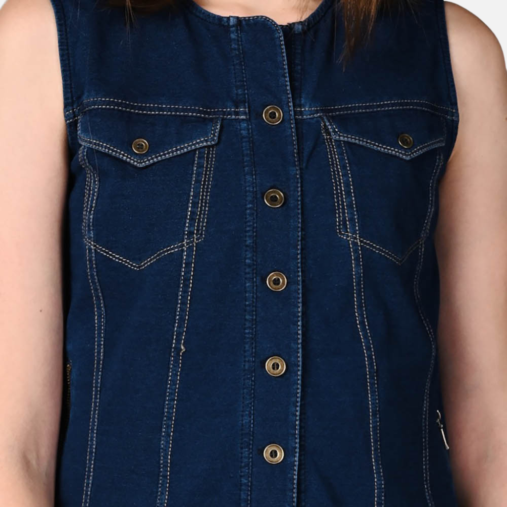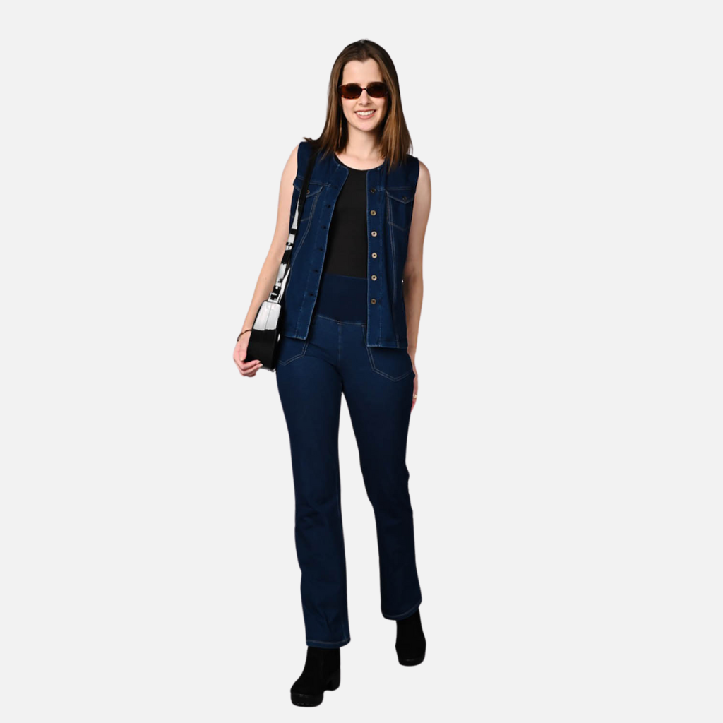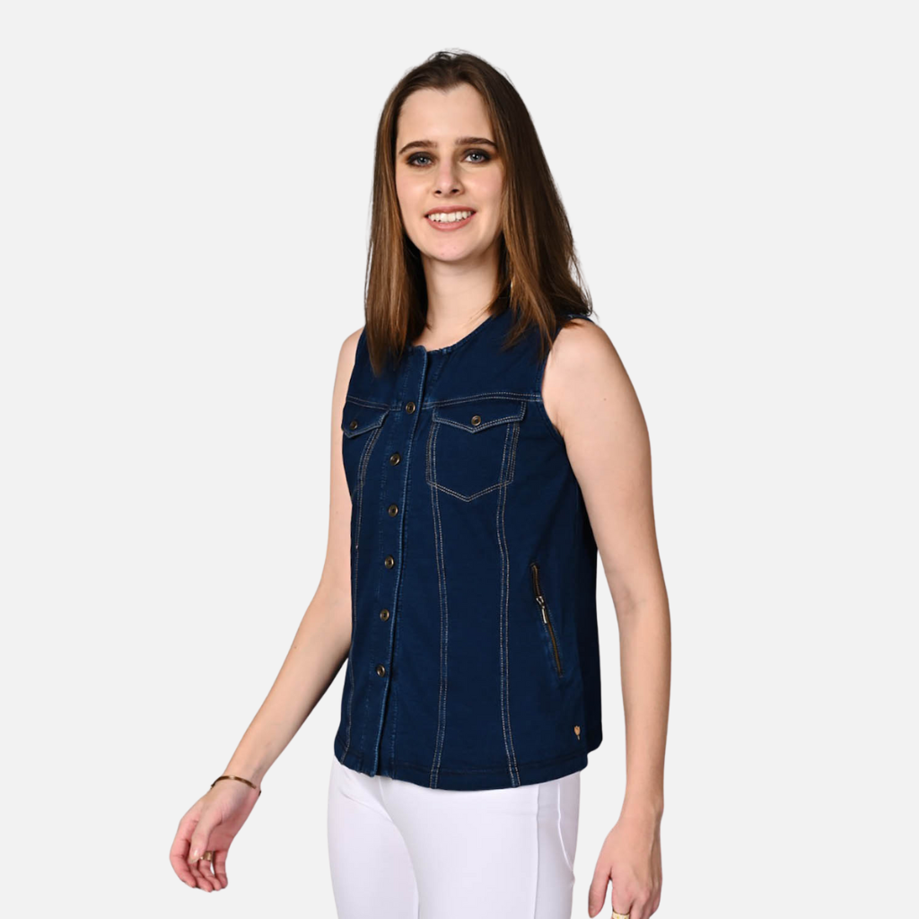 The Tulip Comfort Wear Sleeveless Stretch Indigo Denim Jacket Top is designed for the woman who balances a busy schedule with a need for ease. It offers a clean structured look that transitions naturally from morning errands to evening social hours. Crafted from a premium cotton rich denim fabric with innovative four-way stretch, this sleeveless piece provides the classic aesthetic of authentic indigo with a modern, flexible fit.