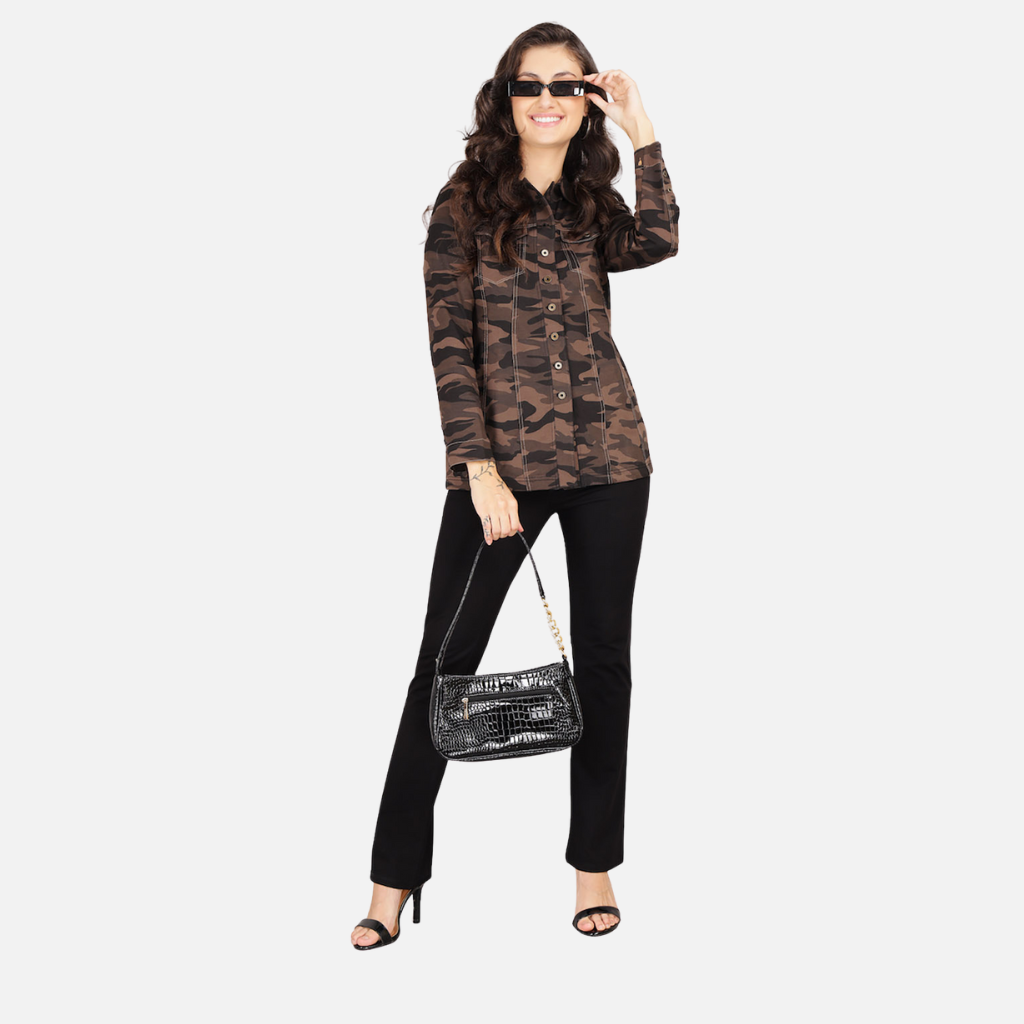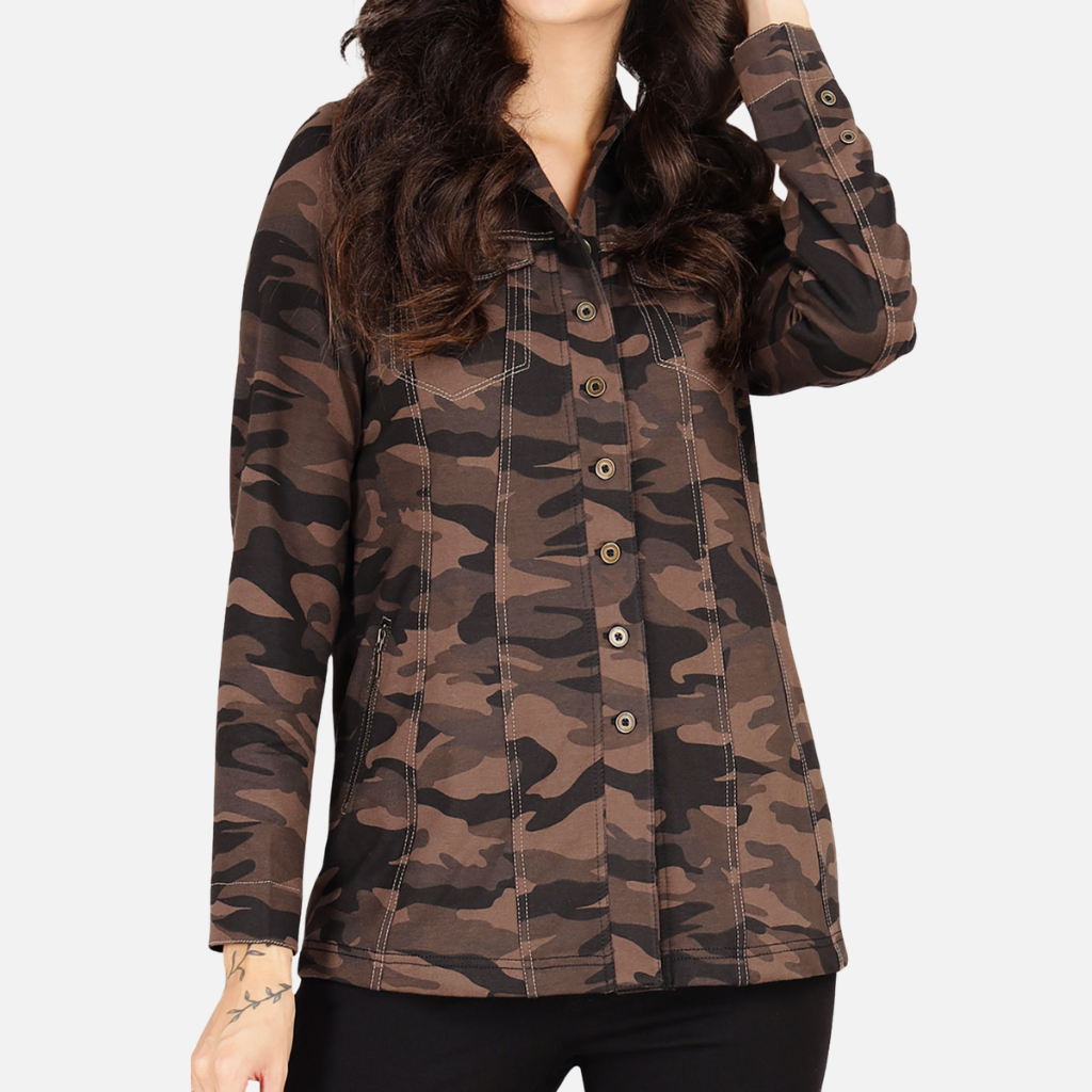 The Tulip Comfort Wear Grey Camouflage Stretch Jacket Shirt with Zipped Pockets is designed for the woman who balances a busy schedule with a need for ease. It offers a clean structured look that transitions naturally from morning meetings to evening social hours. Crafted from a premium cotton rich stretch fabric this jacket shirt provides a rugged yet refined camouflage print with the soft breathable feel needed for all day wear.