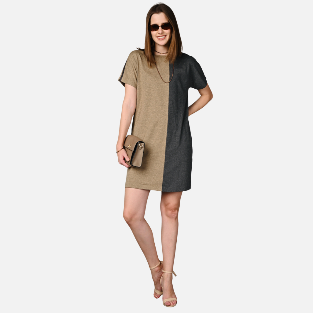 The Tulip Comfort Wear Fawn Grey Melange Stretch Round Neck Dress is designed for the woman who balances a busy schedule with a need for ease. It offers a clean, modern look that transitions naturally from morning errands to evening social hours. Crafted from a premium melange stretch fabric, this dress features a sophisticated heathered texture in a neutral fawn grey, providing a soft, breathable feel for all-day comfort.