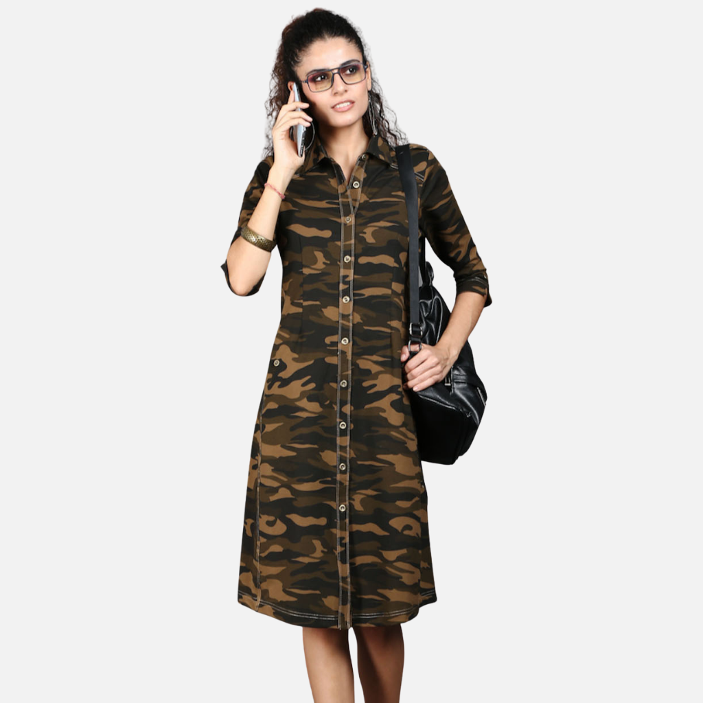 The Tulip Comfort Wear Khaki Camouflage Defender Dress is designed for the woman who balances a busy schedule with a need for ease. It offers a clean, structured look that transitions naturally from morning errands to evening social hours. Crafted from a premium cotton rich stretch fabric, this dress features a bold khaki camouflage print that brings a modern, adventurous edge to a functional and comfortable silhouette.