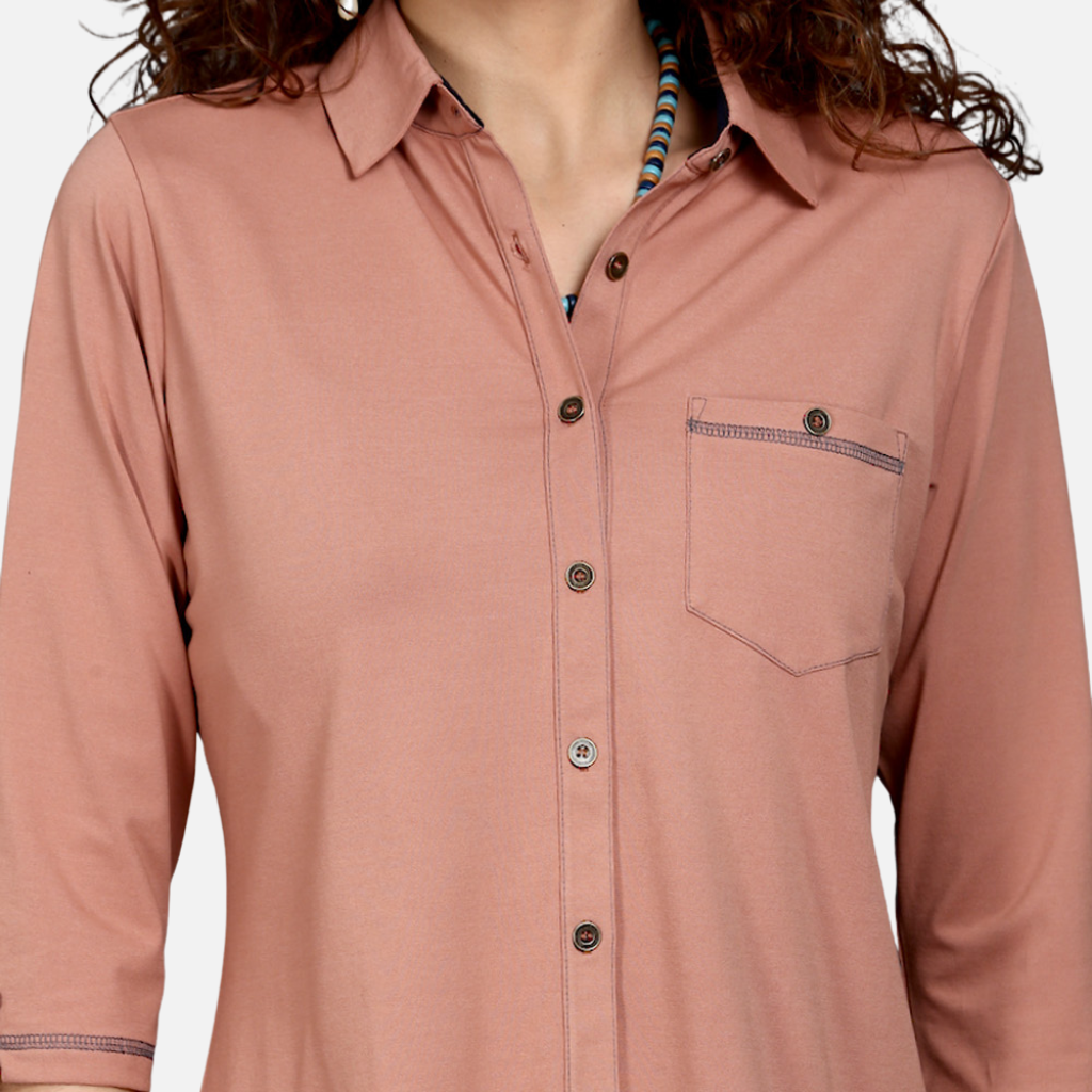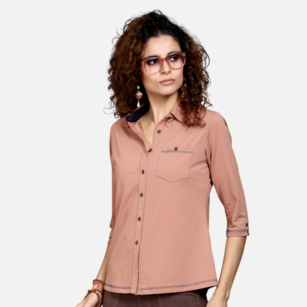 The Tulip Comfort Wear Light Brown Stretch Shirt with Grey Stitch and Front Pocket is designed for the woman who balances a busy schedule with a need for ease. It offers a clean structured look that transitions naturally from morning meetings to evening social hours. Crafted from a premium cotton rich stretch fabric this shirt provides a warm earthy tone with the soft breathable feel needed for all day wear.