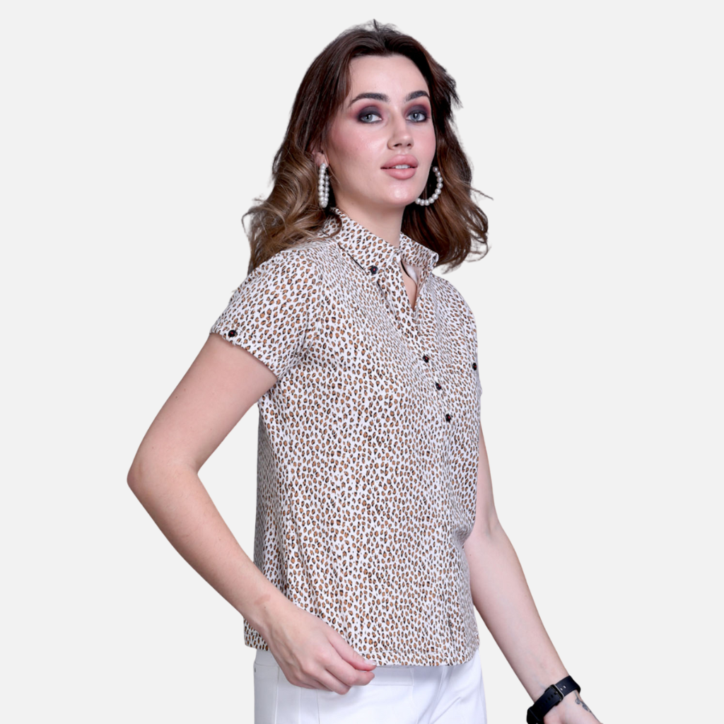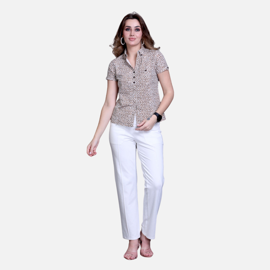 The Tulip Comfort Wear Light Leopard Print Shirt Stretch Cotton Top is designed for the woman who balances a bold personal style with a need for professional poise. It offers a clean, structured look that transitions naturally from the workplace to evening social hours. Crafted from a premium cotton rich stretch fabric, this top features a subtle take on the classic animal print, providing a sophisticated flair that remains understated and elegant.