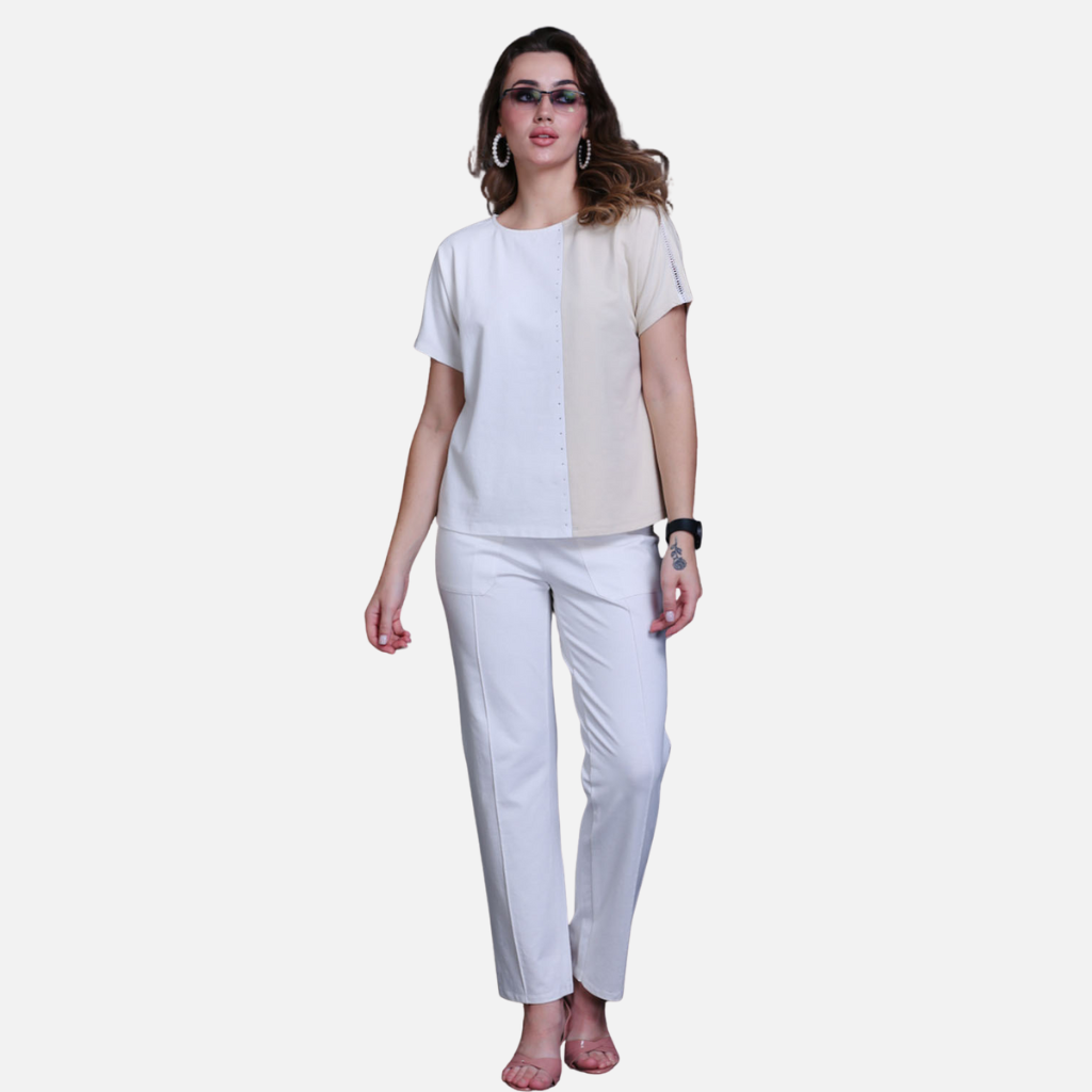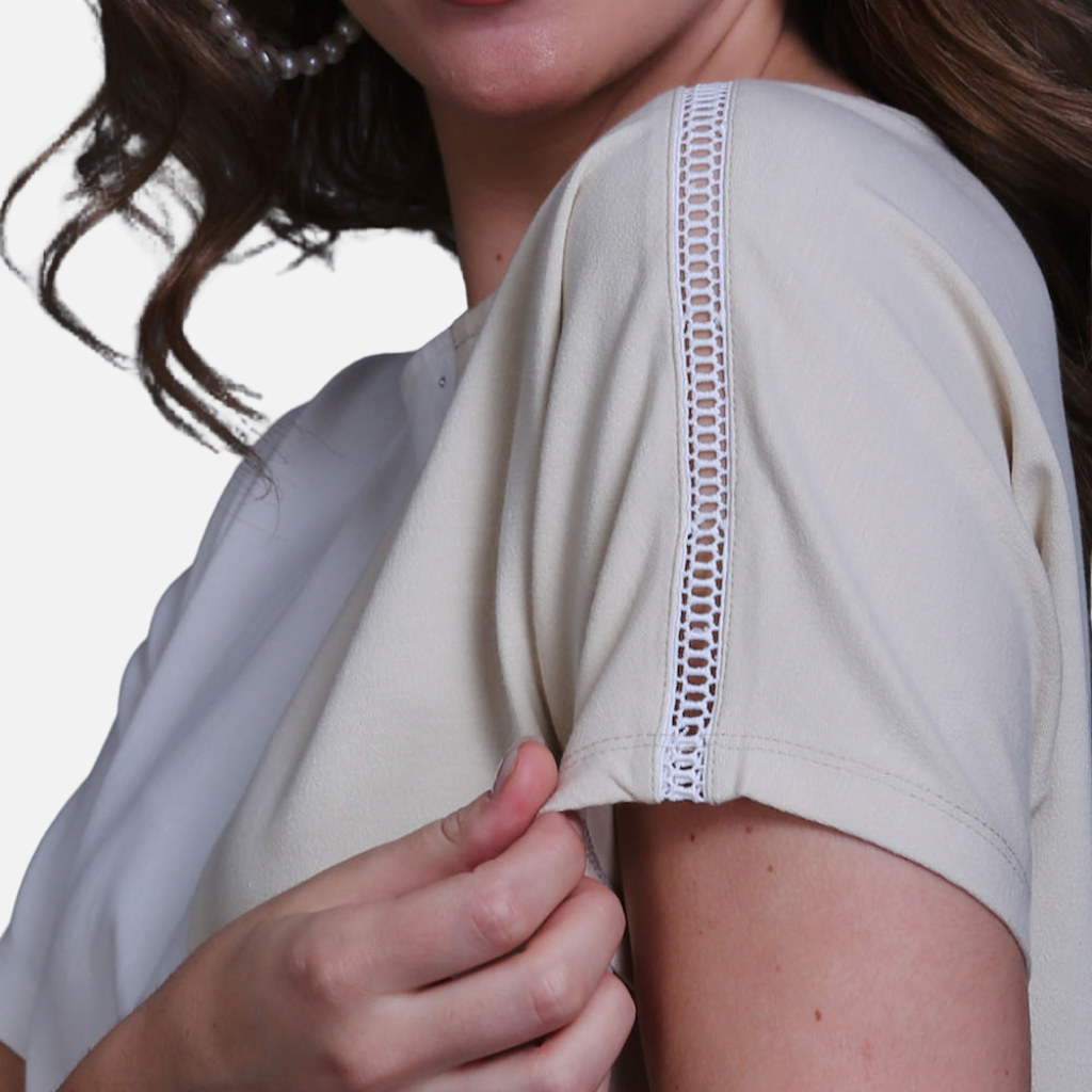 The Tulip Comfort Wear Fawn & White Cotton Stretch Dolman Sleeve Top is designed for the woman who balances a busy schedule with a need for ease. It offers a modern, relaxed silhouette that transitions naturally from morning errands to evening social hours. Crafted from a premium cotton rich stretch fabric in a sophisticated neutral palette, this top combines effortless comfort with luxurious Swarovski accents for a polished look that feels as good as it looks.