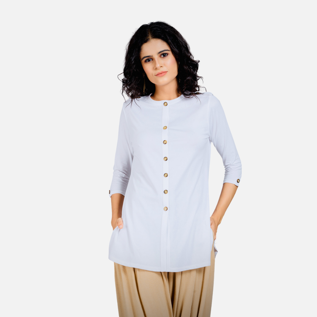 The Tulip Comfort Wear White Long Round Neck Kurta Top is designed for the woman who balances a busy schedule with a need for ease. It offers a clean structured look that transitions naturally from morning errands to evening social hours. Crafted from a premium cotton rich stretch fabric, this top provides a crisp, timeless profile with the soft, breathable feel needed for all-day comfort.