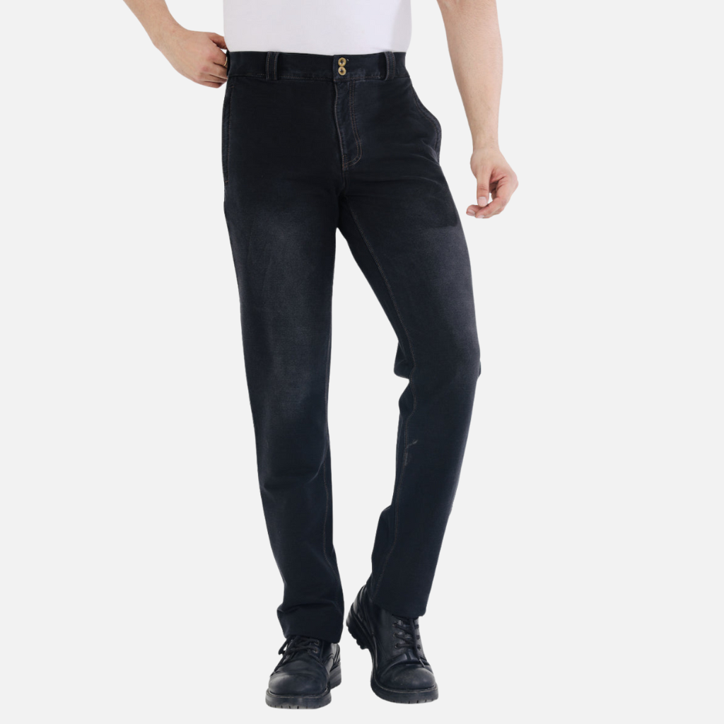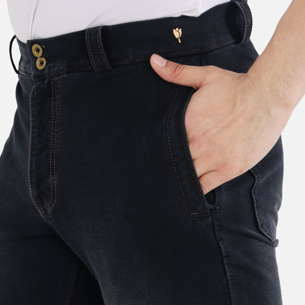 The Tulip Comfort Wear Men’s Charcoal Black Stretch Denim Jeans are the ultimate hybrid for the modern man. Combining the rugged aesthetic of classic denim with the unparalleled softness of a knit fabric, these jeans are designed to keep up with a fast-paced lifestyle. The charcoal black wash offers a more sophisticated, muted alternative to traditional blue denim, while the artisanal brown threadwork adds a touch of heritage-inspired detail.