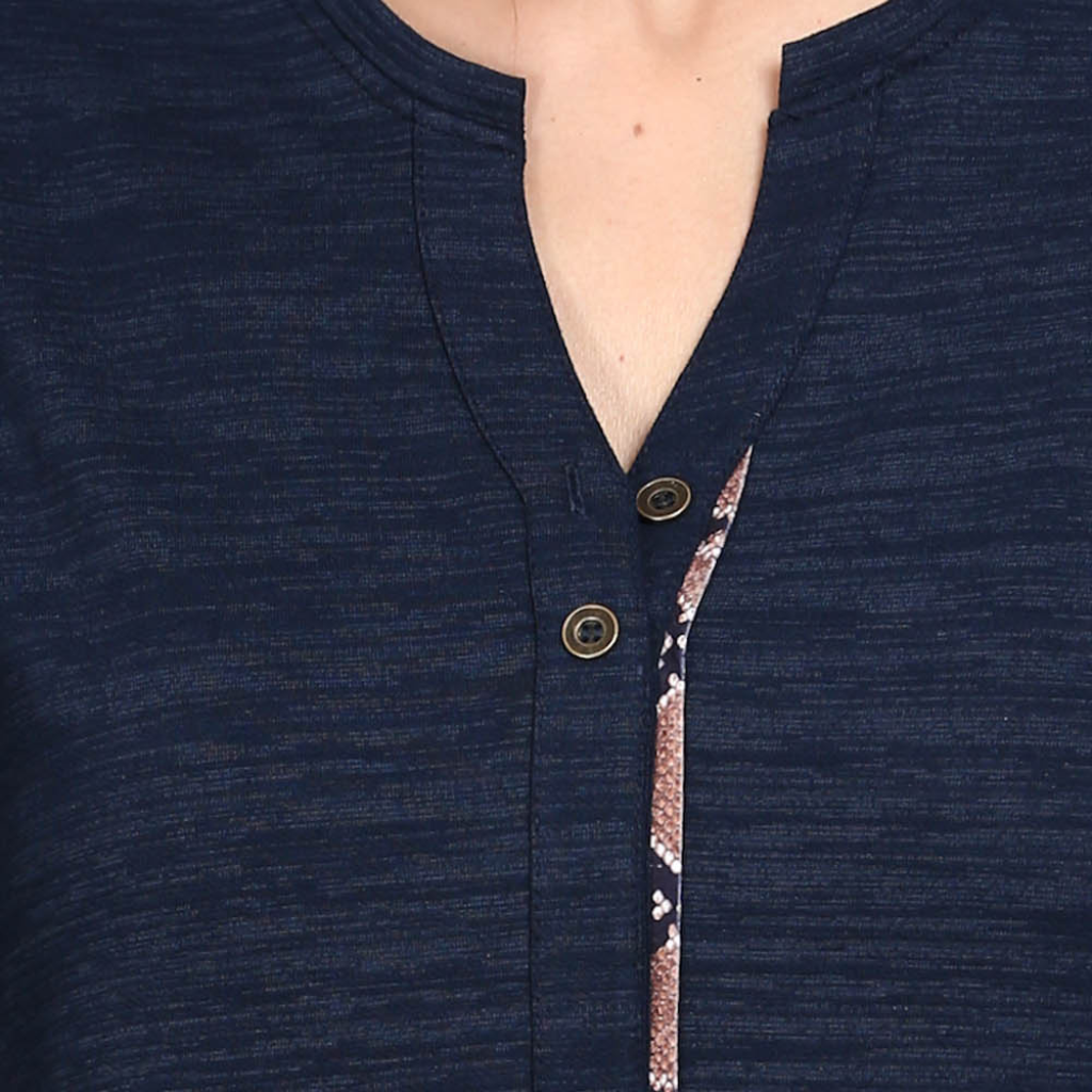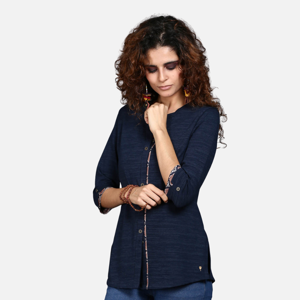 The Tulip Comfort Wear Navy Long Top with Animal Print Highlights is designed for the woman who balances a busy schedule with a need for ease. It offers a clean structured look that transitions naturally from morning errands to evening social hours. Crafted from a premium cotton rich stretch fabric, this top elevates a classic navy base with bold leopard print accents, offering a sophisticated edge to a versatile, elongated silhouette.