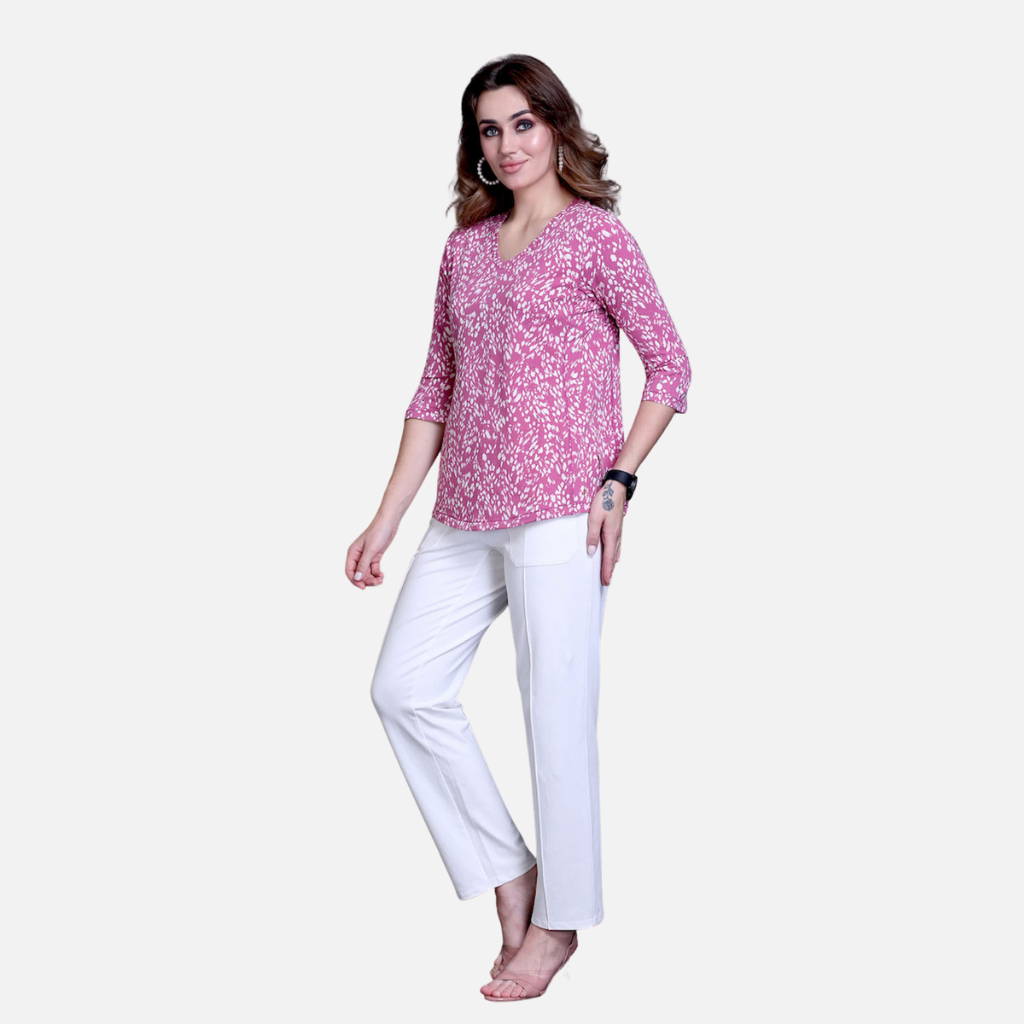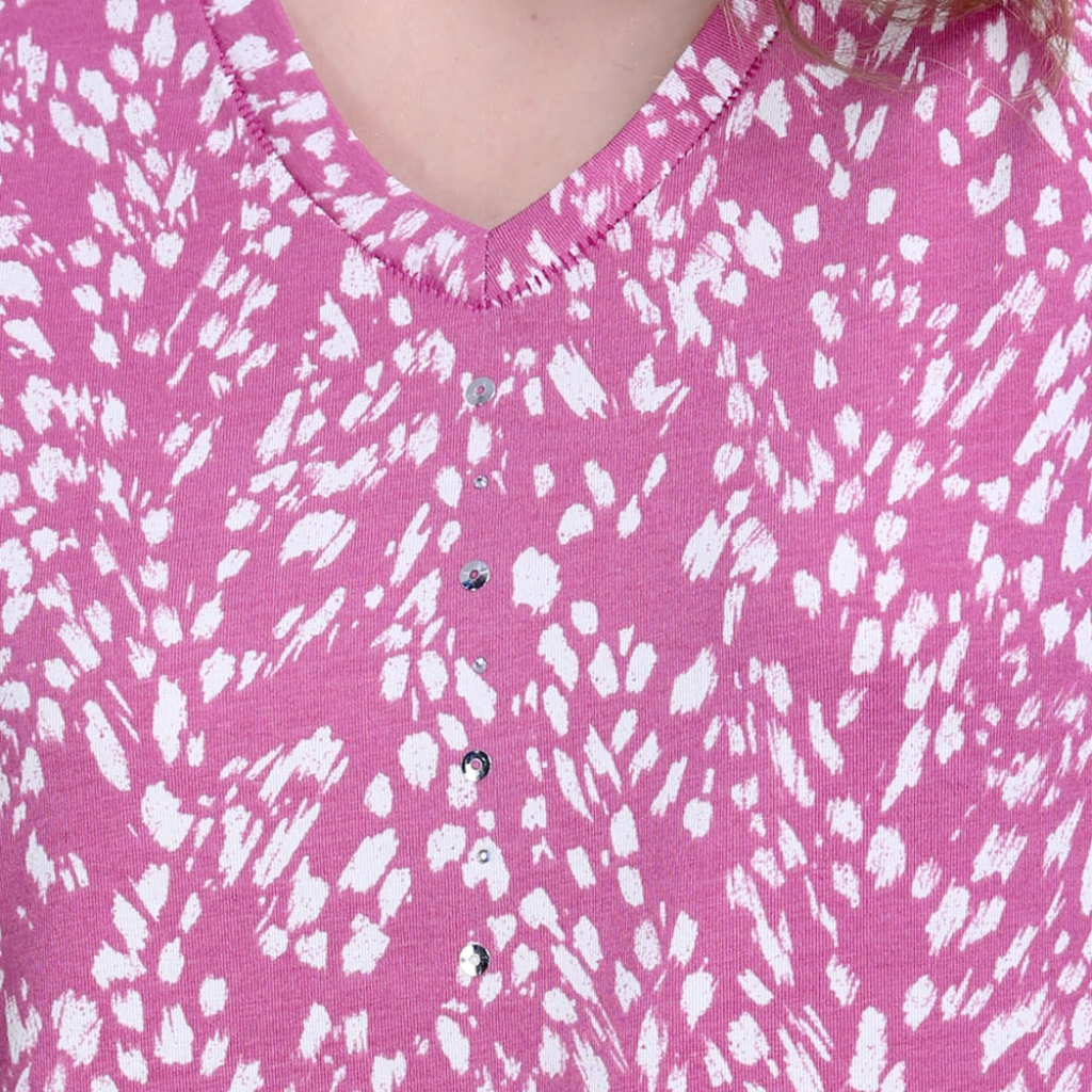 The Tulip Comfort Wear Pink Animal Print Stretch Top is designed for the woman who balances a vibrant personal style with a need for all-day ease. It offers a clean, structured look that transitions naturally from daytime tasks to evening social hours. Crafted from a premium cotton rich stretch fabric, this top features a playful yet sophisticated animal print in shades of pink, accented with luxurious Swarovski details for a look that is both bold and refined.