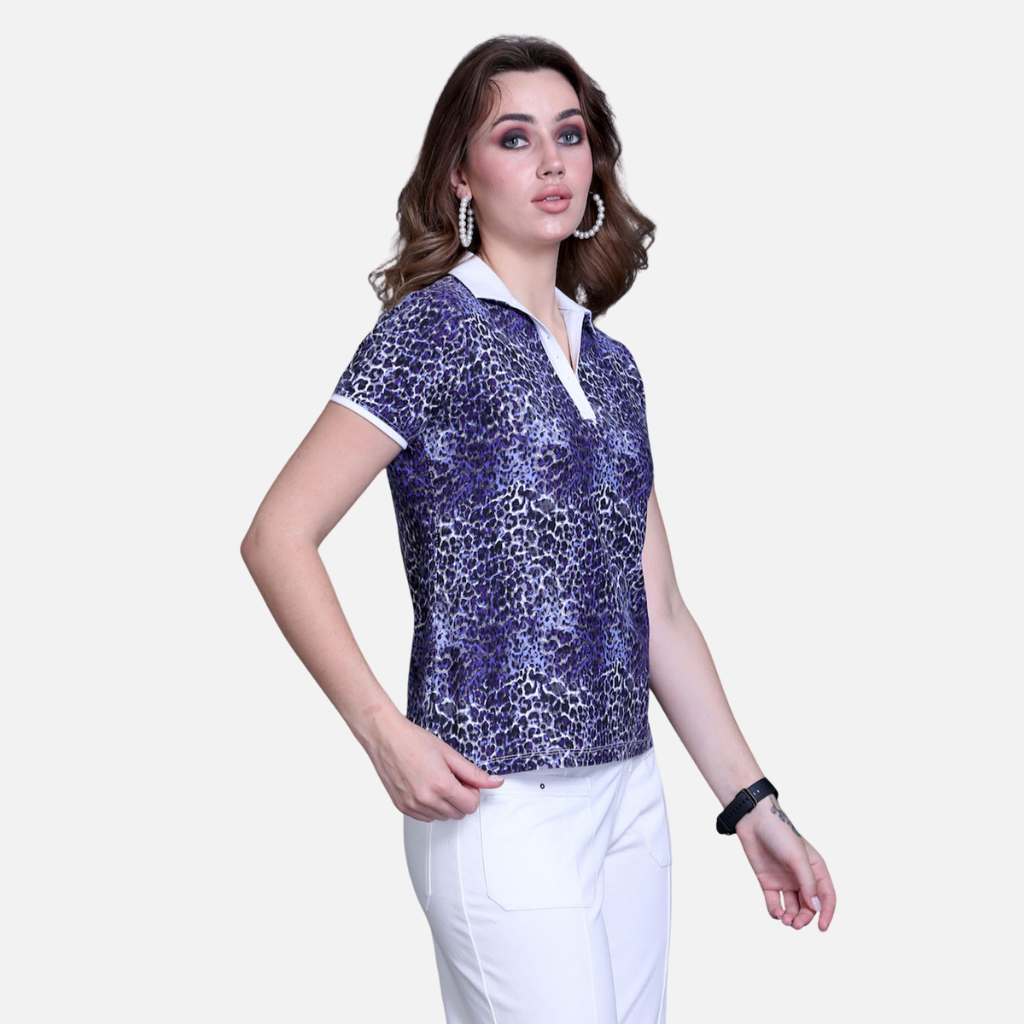 The Tulip Comfort Wear Purple Leopard Print Cotton T-Shirt is designed for the woman who balances a busy schedule with a need for ease. It offers a clean, modern look that transitions naturally from morning errands to evening social hours. Crafted from a premium cotton rich stretch fabric, this top features a bold purple leopard print and genuine Swarovski accents on the collar, providing a playful yet high-end aesthetic with a soft, breathable feel for all-day comfort.