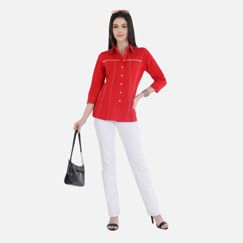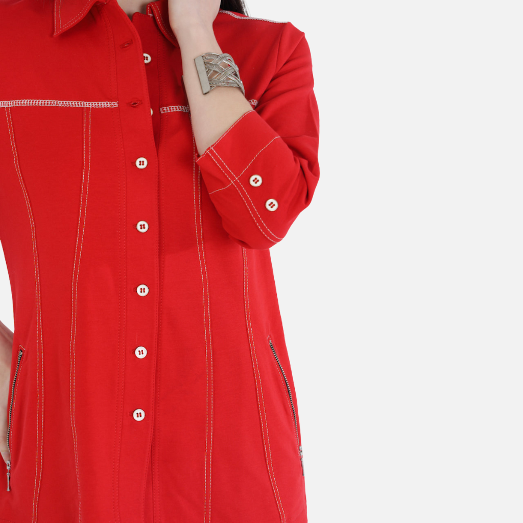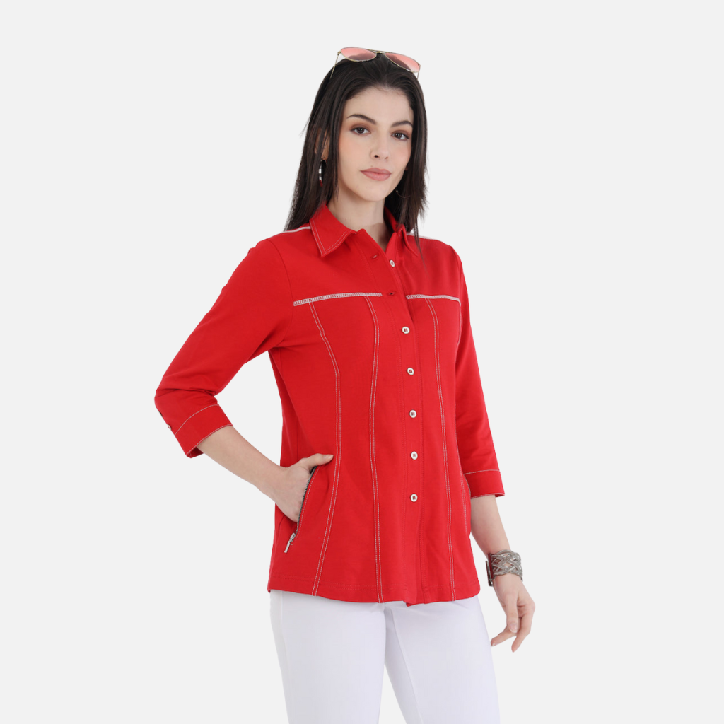 The Tulip Comfort Wear Classic Red Cotton Stretch Shirt Jacket is designed for the woman who balances a busy schedule with a need for ease. It offers a clean structured look that transitions naturally from morning meetings to evening social hours. Crafted from a premium cotton rich stretch fabric this shirt jacket provides a bold and confident aesthetic with the soft breathable feel needed for all day wear.