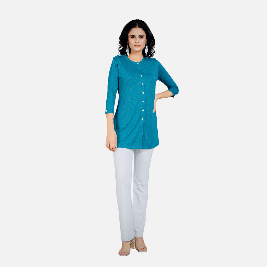 The Tulip Comfort Wear Gloss Blue Long Kurta Top is designed for the woman who balances a busy schedule with a need for ease. It offers a clean structured look that transitions naturally from morning errands to evening social hours. Crafted from a premium cotton-poly stretch fabric, this long kurta provides a subtle, sophisticated sheen and the flexible, breathable feel needed for all-day wear in a vibrant, deep blue hue.