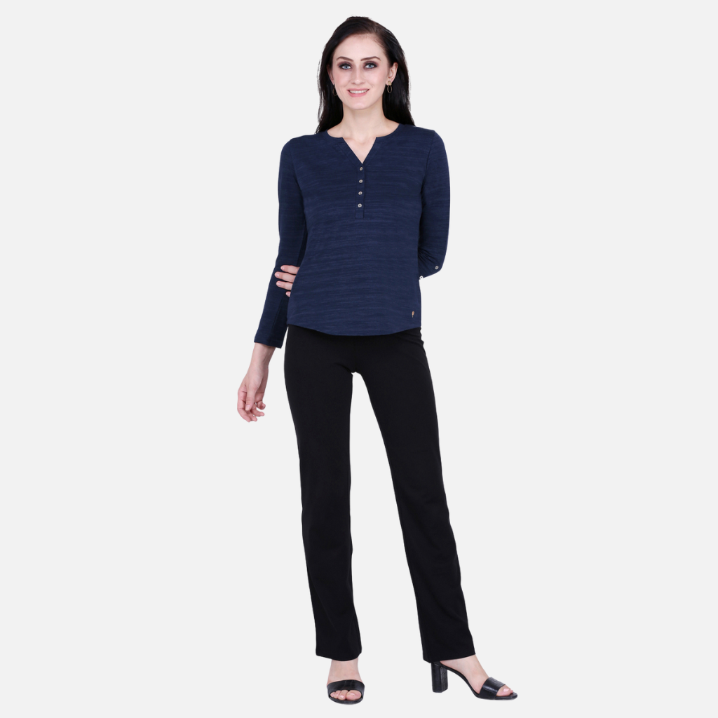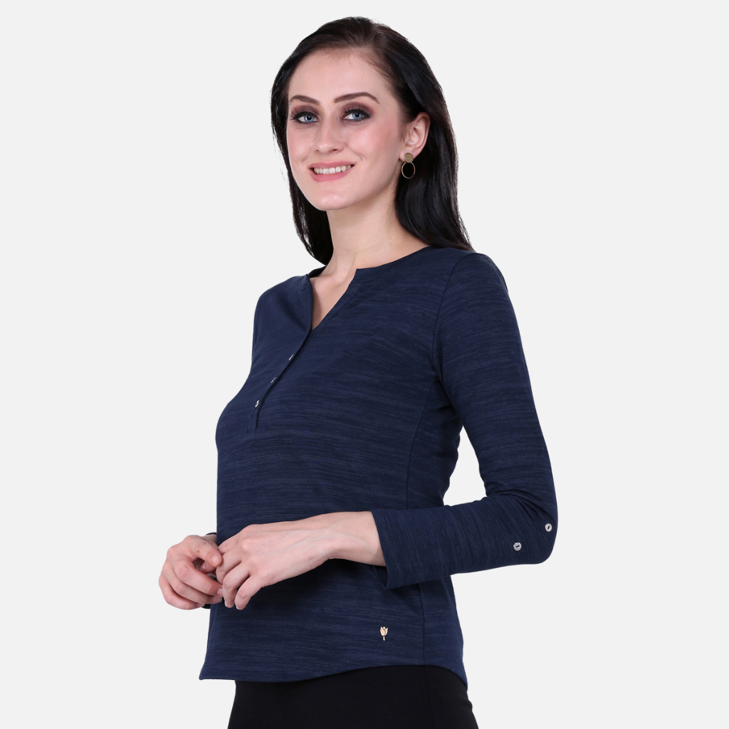 The Tulip Comfort Wear Navy Texture V Neck Stretch Top is designed for the woman who balances a busy schedule with a need for ease. It offers a clean structured look that transitions naturally from morning errands to evening social hours. Crafted from a premium cotton rich stretch fabric with a sophisticated textured finish, this top provides a deep, versatile navy profile with the soft, breathable feel needed for all-day wear.