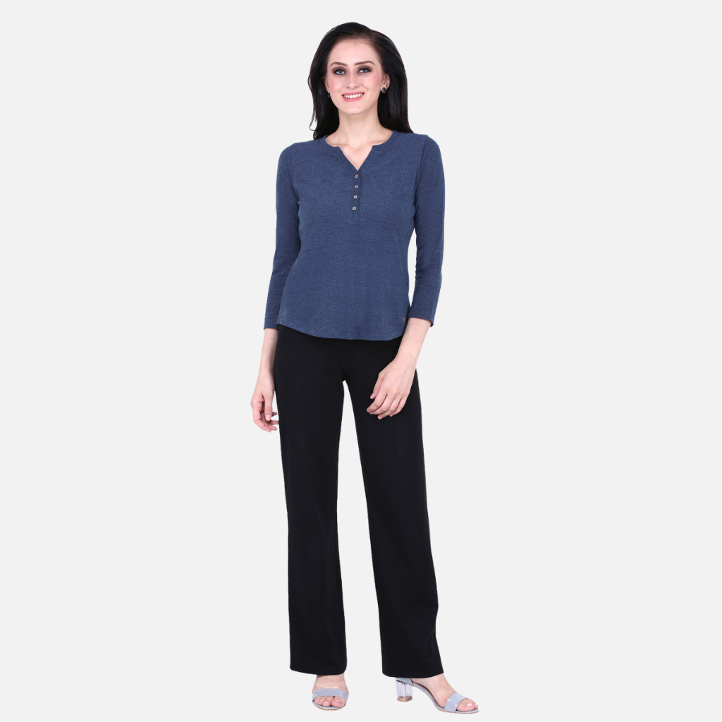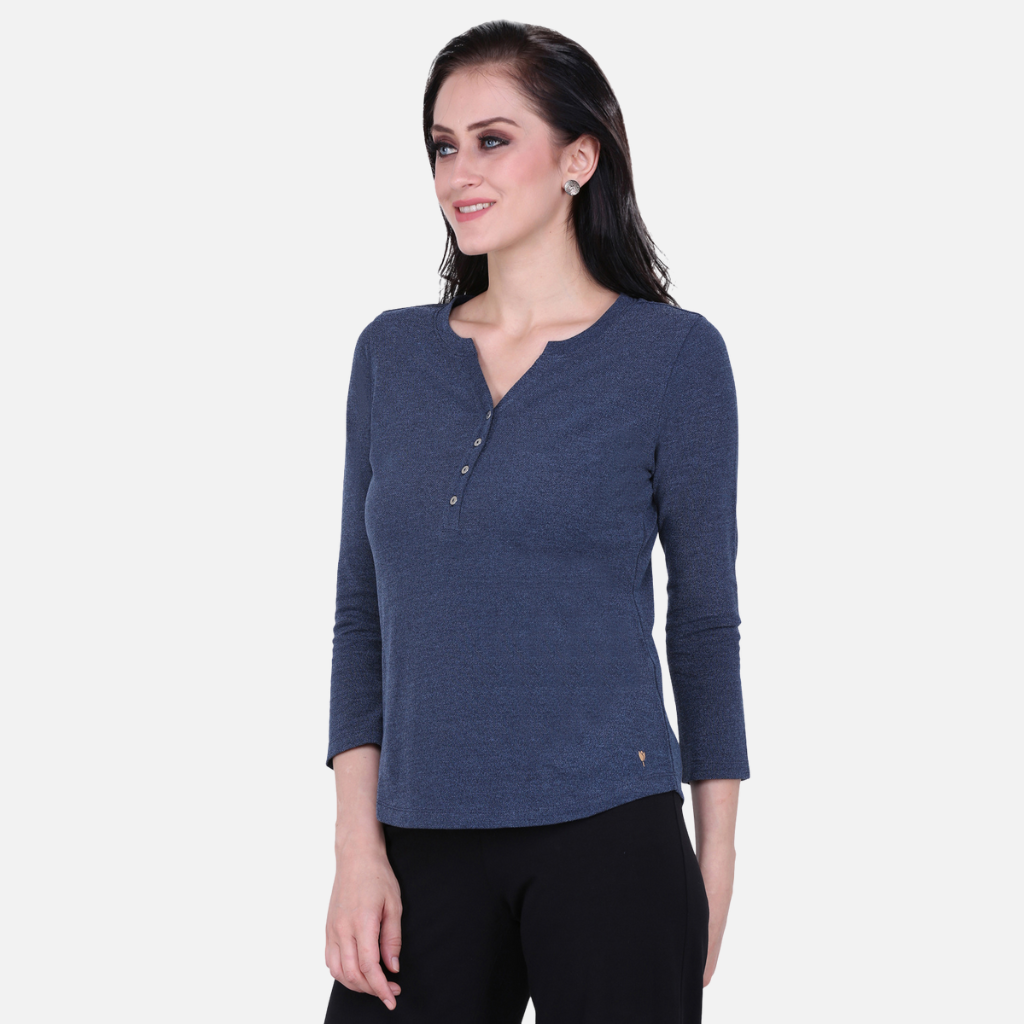 The Tulip Comfort Wear Blue Weave V Neck Stretch Top is designed for the woman who balances a busy schedule with a need for ease. It offers a clean structured look that transitions naturally from morning errands to evening social hours. Crafted from a premium cotton rich stretch fabric with a sophisticated dual-colour weave, this top provides a rich textured aesthetic with the soft, breathable feel needed for all-day wear.