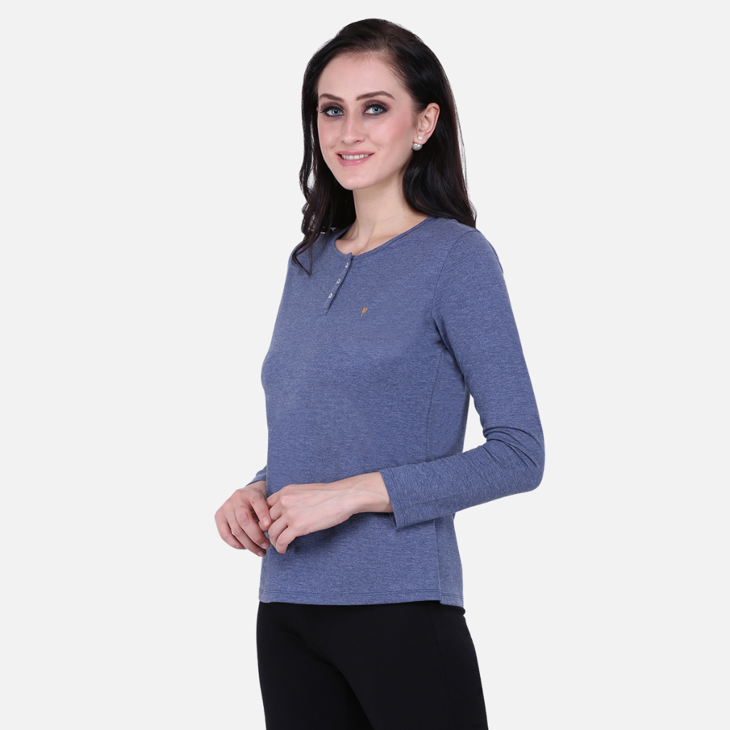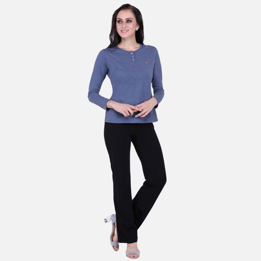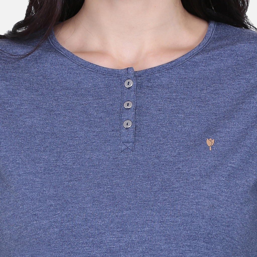 The Tulip Comfort Wear Plain Melange Blue Round Neck Stretch Top is designed for the woman who balances a busy schedule with a need for ease. It offers a clean structured look that transitions naturally from morning errands to evening social hours. Crafted from a premium cotton rich stretch fabric with a melange finish, this top provides a sophisticated tonal depth and the soft, breathable feel needed for all-day wear.