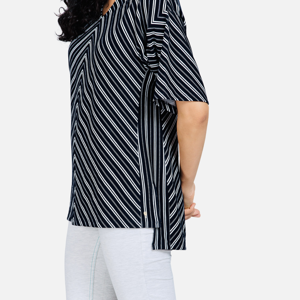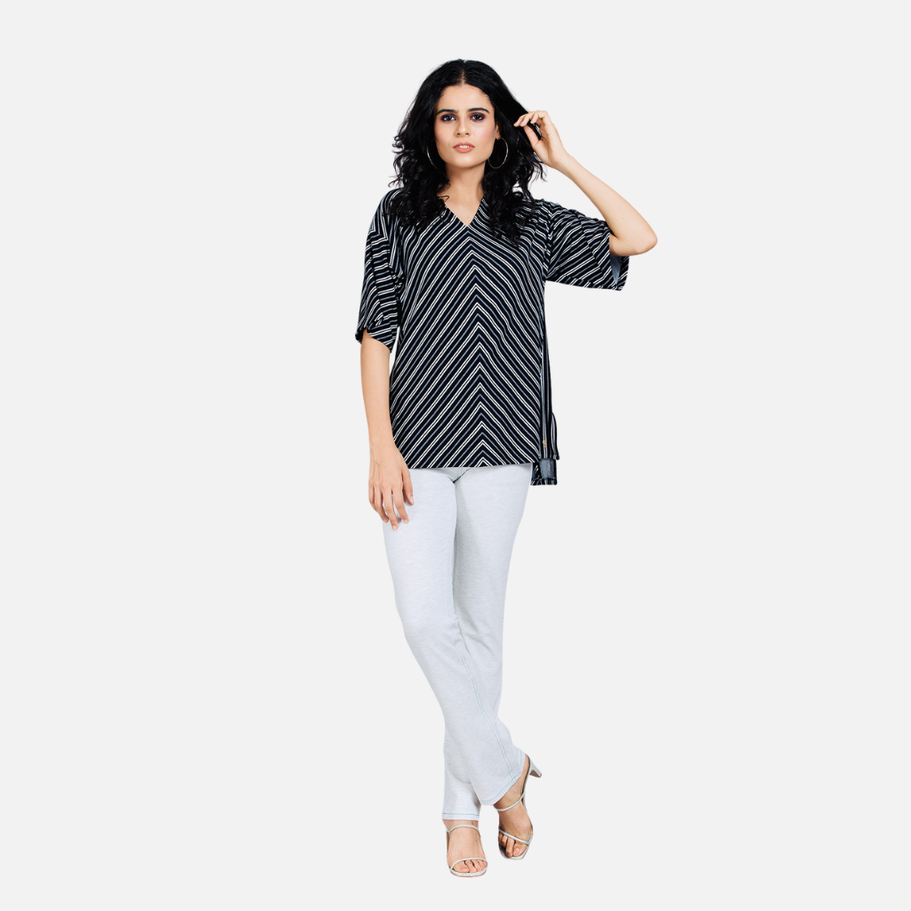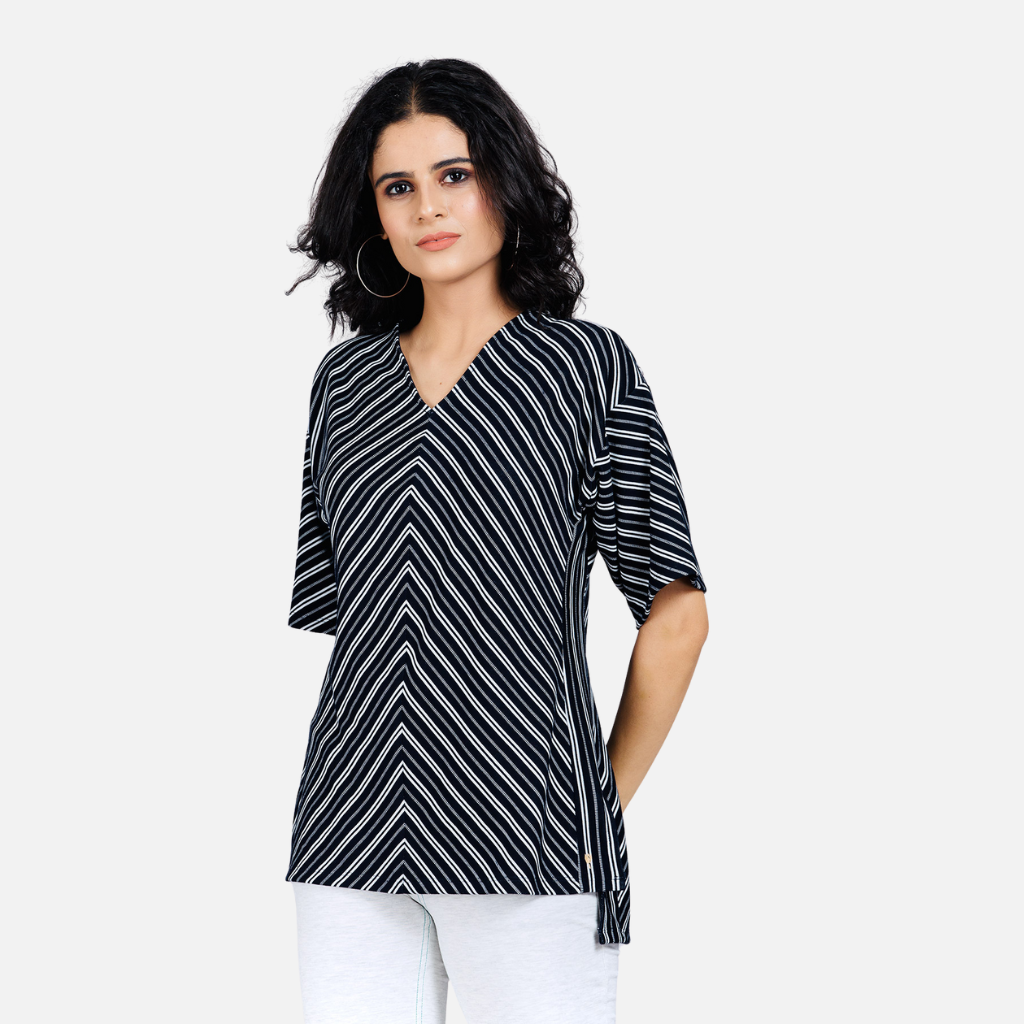 The Tulip Comfort Wear Black and White Striped Pattern Top is designed for the woman who balances a busy schedule with a need for ease. It offers a clean, modern aesthetic that transitions naturally from morning errands to evening social hours. Crafted from a premium viscose rich stretch jacquard fabric, this top features a timeless striped pattern that provides a sophisticated texture and a soft, breathable feel for all-day wear.