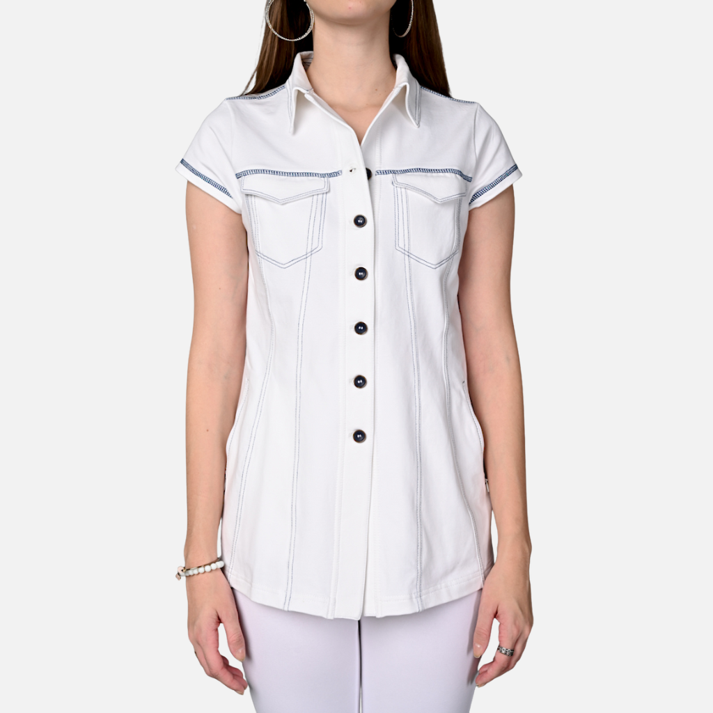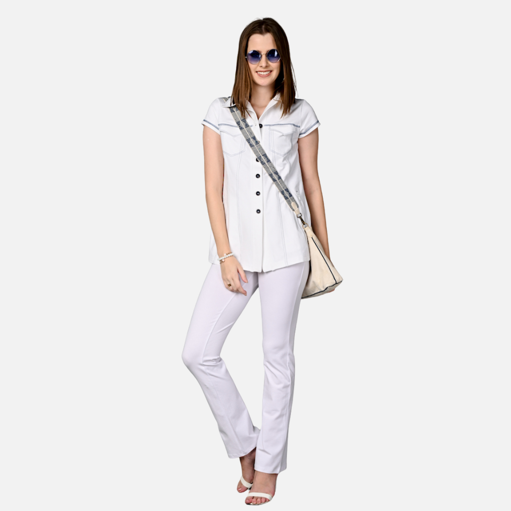 The Tulip Comfort Wear White Cotton Stretch Jacket Top is designed for the woman who balances a busy schedule with a need for ease. It offers a clean structured look that transitions naturally from relaxed mornings to evening social hours. Crafted from a premium cotton rich stretch fabric, this jacket top provides a crisp, breathable feel with a unique contrast detail that adds a modern edge to a classic white silhouette.