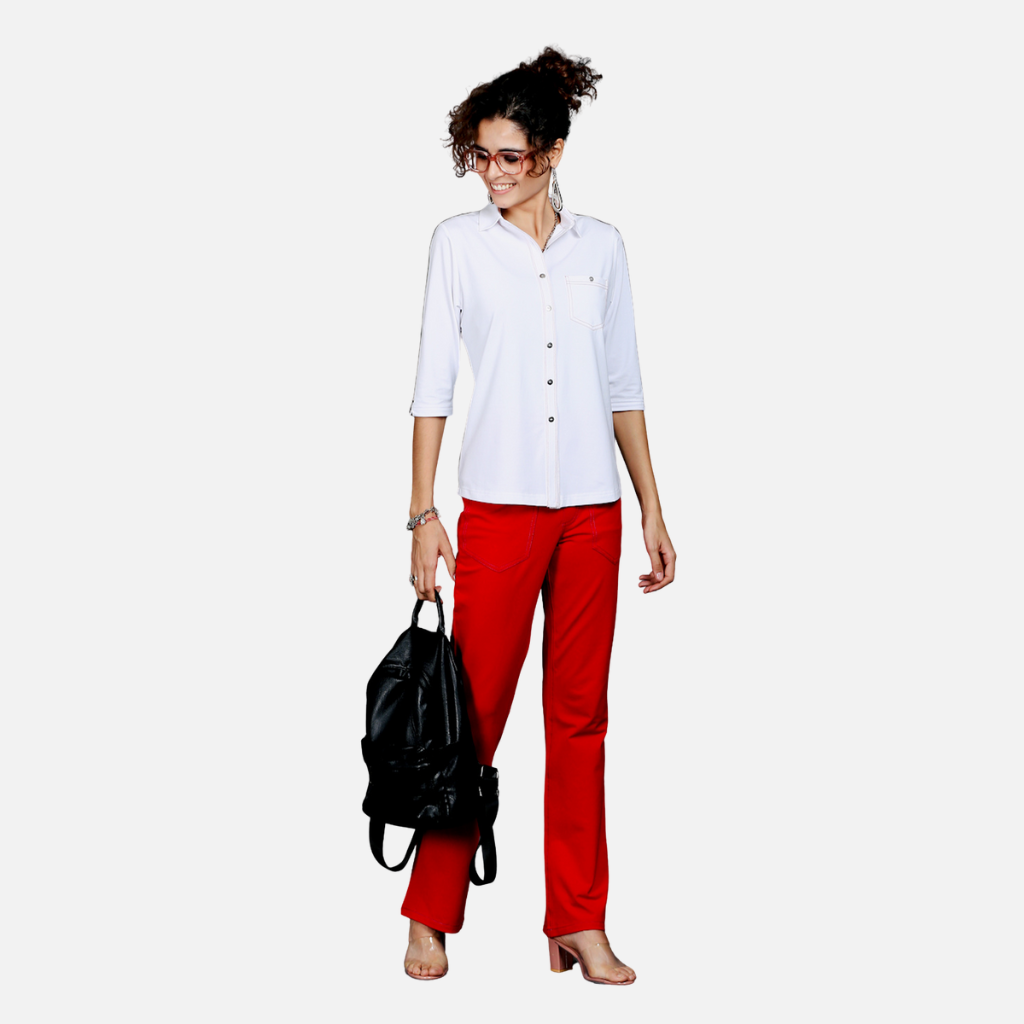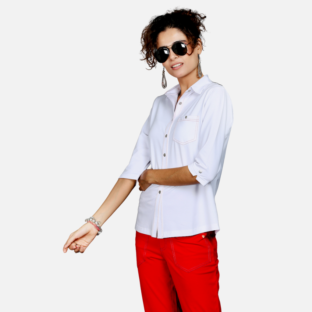 The Tulip Comfort Wear White Stretch Shirt with Red Stitch Details is designed for the woman who balances a busy schedule with a need for ease. It offers a clean structured look that transitions naturally from morning meetings to evening social hours. Crafted from a premium cotton rich stretch fabric, this shirt provides a crisp, bright aesthetic with a playful yet professional edge, ensuring all-day comfort and breathability.