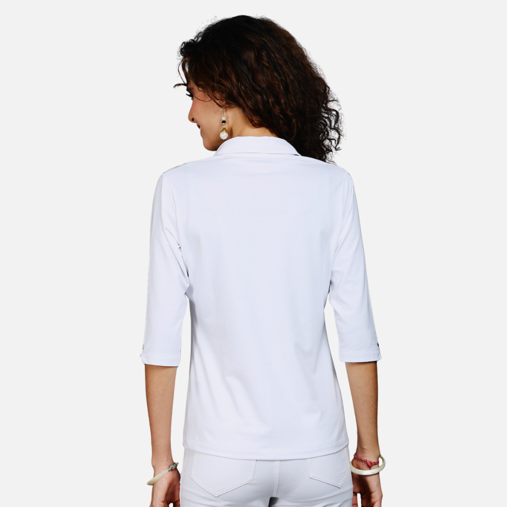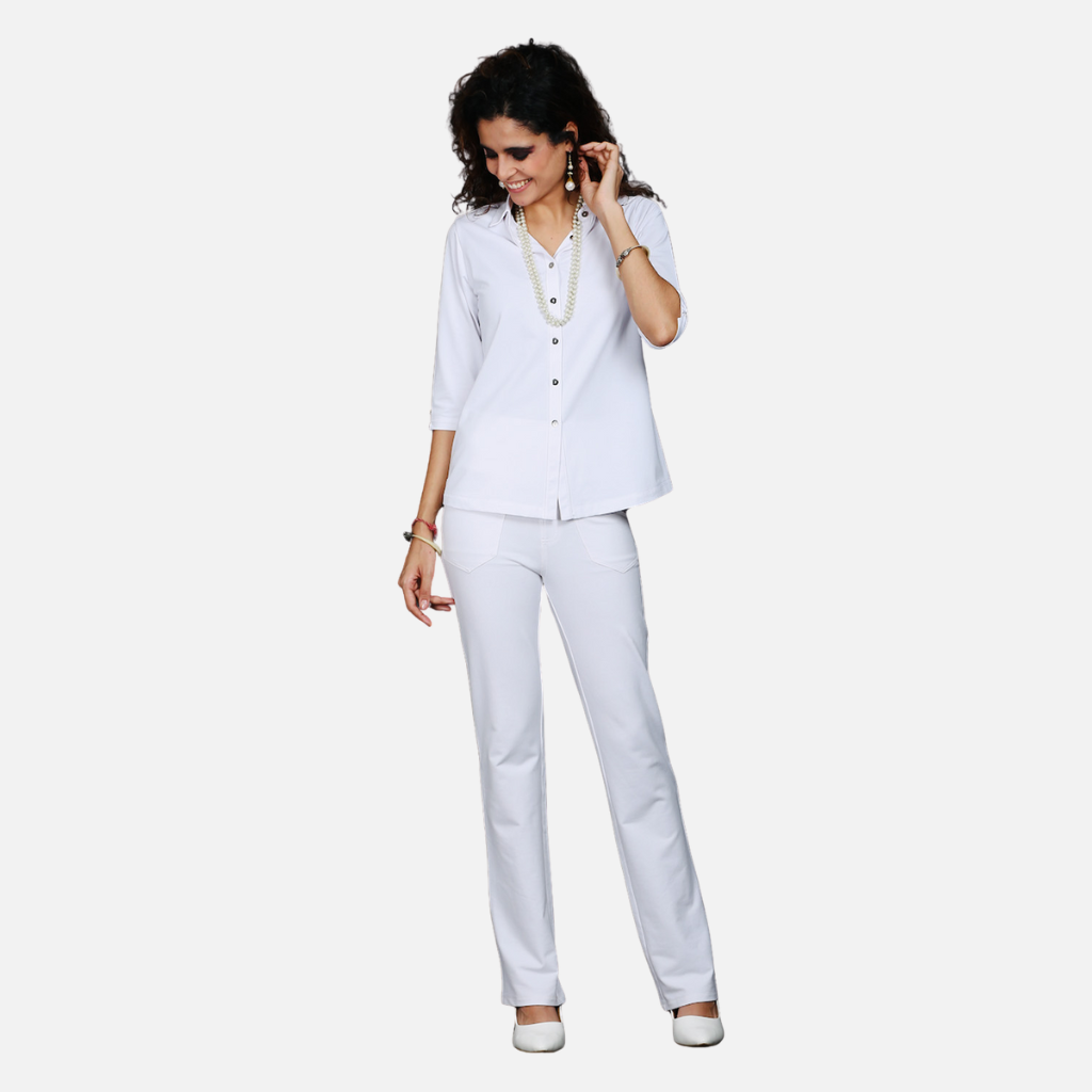 The Tulip Comfort Wear White Cotton Stretch Shirt is designed for the woman who balances a busy schedule with a need for ease. It offers a clean structured look that transitions naturally from morning meetings to evening social hours. Crafted from a premium cotton rich stretch fabric this shirt provides a crisp and pristine profile with the soft breathable feel needed for all day wear.